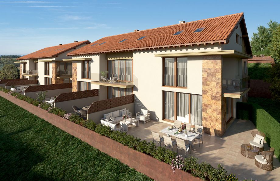 Otras tipologías de Urbanización La Braña son las viviendas adosadas que se distribuyen en seis bloques con plantas bajas con jardín y terrazas y plantas primeras tipo dúplex. Opciones de tipologías que complementan la oferta de este fantástico proyecto.